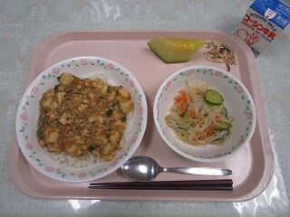 牛乳、麻婆豆腐丼、はるさめサラダ、メロン、小魚アーモンド