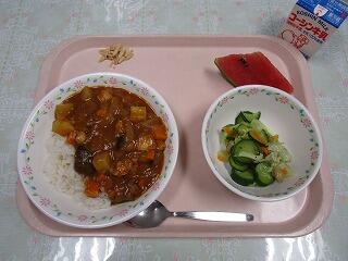 牛乳、夏野菜のカレーライス、青大豆のバジルサラダ、すいか、小魚アーモンド
