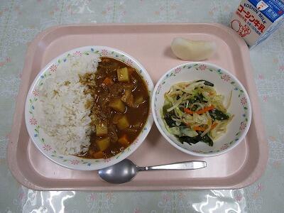 今日で一学期の給食は最後です。いつもおいしそうに給食を食べてくれてありがとうございました。最後の給食は給食室特製のカレーライスです。サラダはドレッシングに乾燥バジルを入れました。栄養を補うアーモンドもしっかり食べましょう。