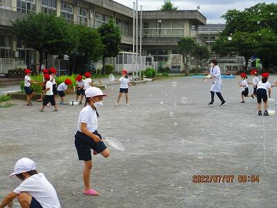 本日,1年生が生活科のシャボン玉遊びを実施しました。理科支援員の