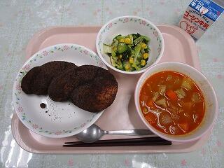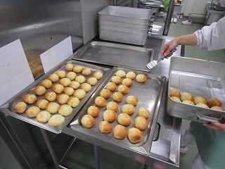 パンは、食 べられる量 の違 いがあるので、低学年 、中学年 、高学年 で大きさを変えています。3年生以上のみなさんは、パンの大きさがかわっていることに気が付いていましたか?今日の「ハムとチーズのホットバーガー」は、給食室でパンの真ん中に「ハム」と「チーズ」を はさんで 焼いて作りました。