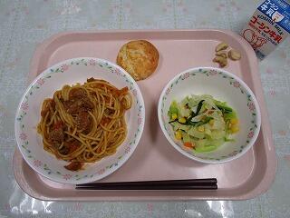 牛乳、スパゲティトマトソース、ハニーマスタードサラダ、もちもちパン、いり大豆