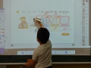 本校では、ICTを活用した授業が多く展開されています。本日の2年生の算数では、数のしくみの学習で、1000が3個、100が9個、10が9個、1が10個集まったらどうなるだろうかという課題を説明するのに、黒板上のスクリーンにペンで書きこみながらわかりやすく人に伝える学習をしていました。