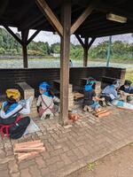 野外炊飯が始まりました。先ほどまでは雨が降っていましたが、今は、やんでいます。グループで協力してカレーを作っています。楽しみです。