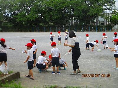 本日,1年生が生活科のシャボン玉遊びを実施しました。理科支援員の