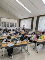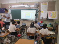 1年生は、ブロックを使っての算数の足し算の計算の学習。2年生は図工の学習で「見つけたよ、わたしの色水づくり」。3年生は、算数の繰り上がりのあるかけ算の学習。4年生は、タブレットを活用しての「ごんぎつね」の読み取り。5年生は、農業の工夫について調べたことのプレゼン発表。6年生は、戦国時代の武将についての調べ学習。