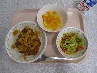 ナンの発祥は,紀元前4000年前のメソポタミア地方と言われていますが,現在は主に北インドで食べられているようです。ナンはちぎってカレーをつけたり、カレーをのせて食べましょう。今日のカレーにはぶた肉・玉ねぎ・にんにく・しょうが・ピクルス・パセリ・大豆・チーズなどが入っています。