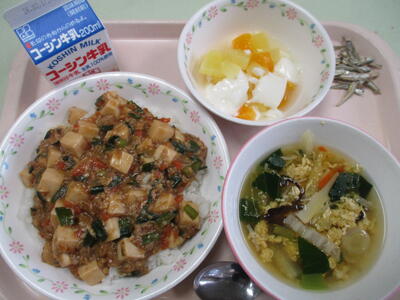 牛乳・マーボー豆腐丼・中華たまごスープ・フルーツ杏仁・小魚