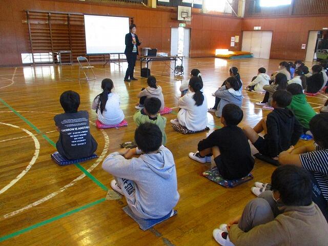 本日,6校時に体育館で6年生が人権集会を開きました。講師として中光先生