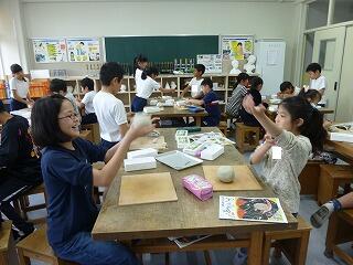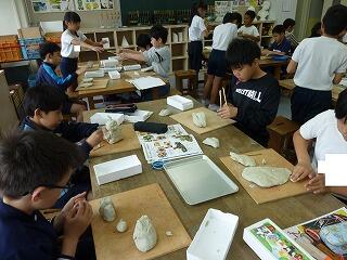 図工室で、5年生が図工「粘土」の学習を行っていました。粘土をこねて丸めていたり、糸を使って平らな面を切り出していたり、中にはほぼ完成に近い作品まで作っていた児童もいました。作業中、一人一人がとっても楽しそうに取り組んでいました。この先、どんな作品になっていくのか楽しみです。