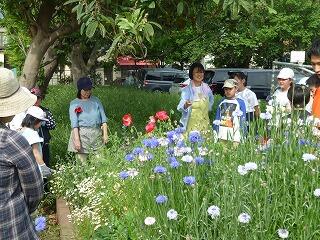 花壇に咲いている花の種類を教えていただき、その後花壇の手入れを一緒に行いました。