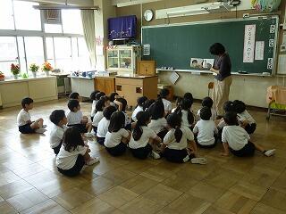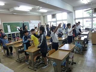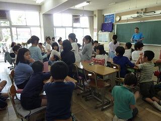 4年生の教室で、両クラスが集まって学年主任の先生から何やらの発表が行われていました。