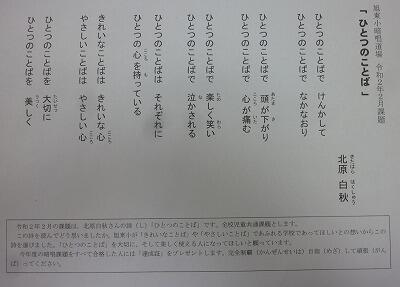 2月の暗唱は、北原白秋さんの詩「ひとつのことば」にしました。旭東小が「きれいなことば」や「やさしいことば」であふれる学校になってほしいと願っています。