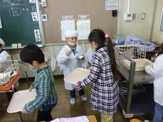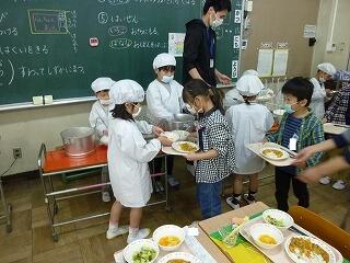 今日から1年生の給食が始まりました。事前の指導がきちんといきわたっており、当番の児童が一生懸命によそう、配ることができました。また当番以外の児童は静かに席に座って待つこともできていました。