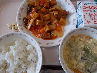 ごはん 酢豚(高野豆腐入り) 中華スープ ザーサイ入り いりカシューナッツ 牛乳