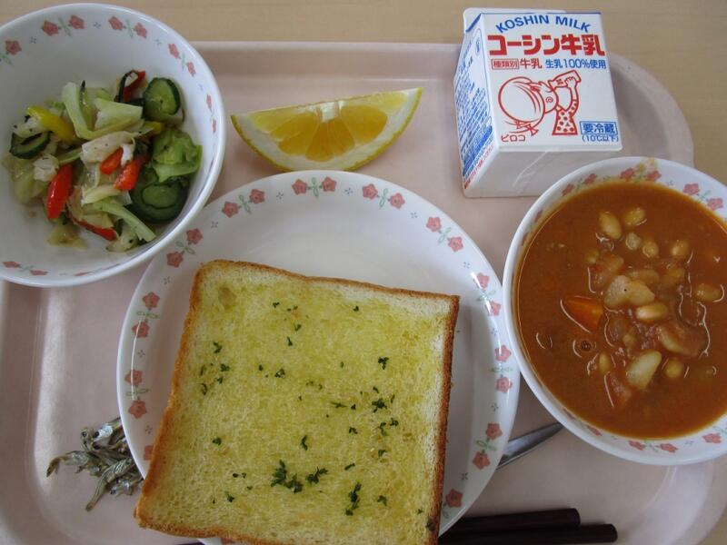 ガーリックトースト とり肉と大豆のトマト煮(うずらの卵入り) イタリアンサラダ パプリカ 晩柑 小魚 牛乳