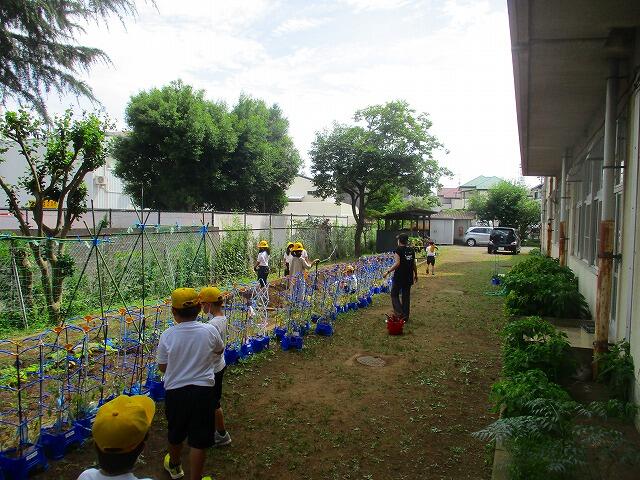 トマトの水やりと収穫を楽しんでいました。自分の植えた場所は覚えていられるのかな。