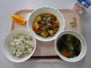 牛乳、菜飯、肉じゃが、小松菜と豆腐のみそ汁、オレンジ、いり大豆