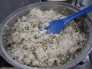 菜飯です。給食室で炊いた白飯に青菜ふりかけなどを混ぜて仕上げました。