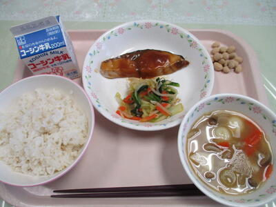 ごはん・いなだの照り焼き・おひたし・白玉みそ雑煮・きなこ大豆・牛乳