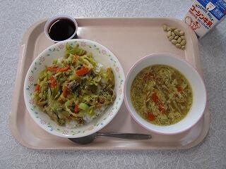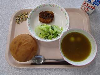 牛乳、まるパン、チキンカツ、グリーンサラダ、カレースープ、大豆小魚