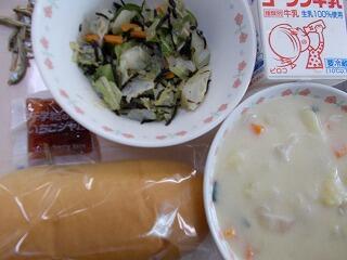 コッペパン いちごジャム じゃが芋のチーズソース煮 ひじきのサラダ 小魚 牛乳