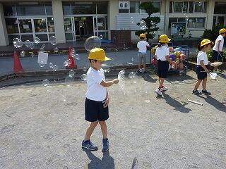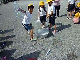 大きなシャボン玉を作りだす方法、数多く一度に作り出す方法等、活動を通して多くの気づきがあり、学びの場面に出会うことができました。