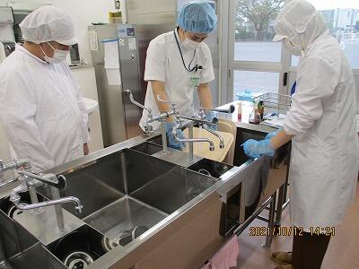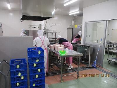 ています。ちょうど給食室では,後片付けと清掃の最中でした。食器については,