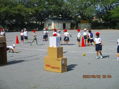 段ボールにあたる音に注目している子もいました。ボールの投げ方の助言を
