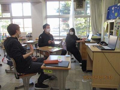 本日,先生方に4つのグループに分かれてもらい,各教室をMeetでつなぎ,
