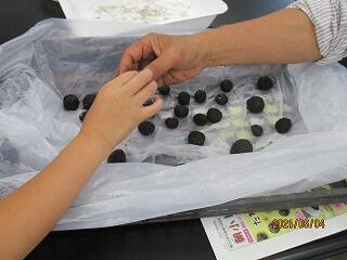 4 ダンゴにたねをつける。『夏まき』のたねを転がして付けます。