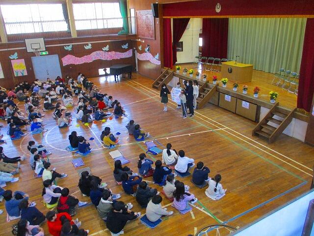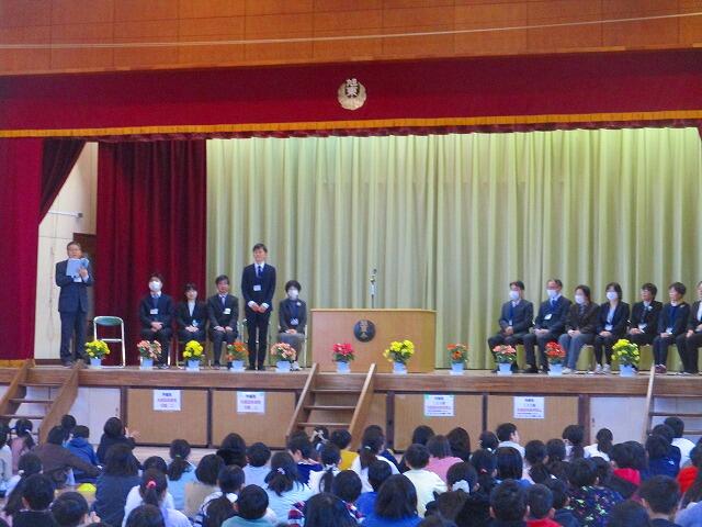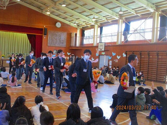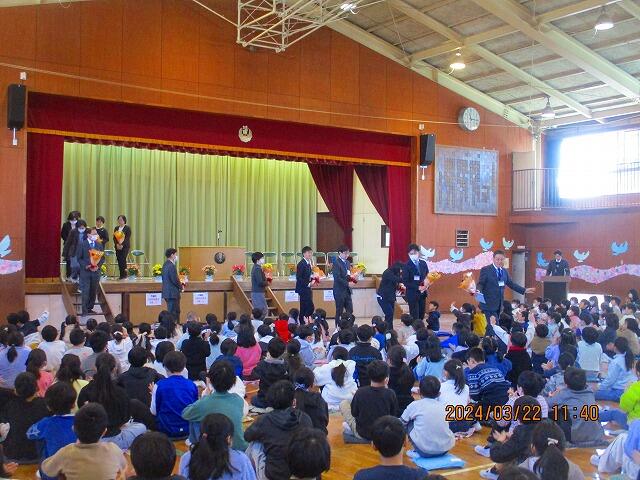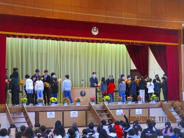 今日は、令和6年度の修了式を行いました。この1年間がんばってきた様子が、子どもたちの表情からも伝わってきました。今日は、交通ボランティアで登校指導していただいている3名の方にも参加していただき、児童会の代表児童から感謝の気持ちを伝えました。修了式の後は、辞校式を行いました。今年度は7名の先生方が転退職となりました。今まで子どもたちのためにご指導いただき、ありがとうございました。新天地でのご活躍を期待しています。