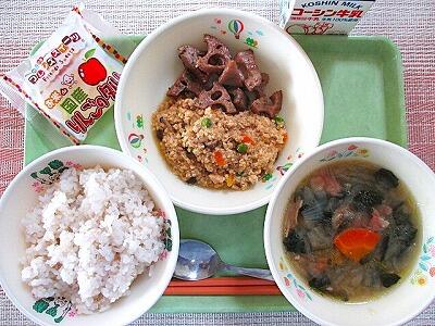 1月28日 牛乳 麦ご飯 鶏ひき肉のバジル炒め のり塩れんこん オニオンスープ りんごのタルト