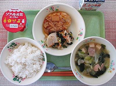 高柳西小学校の6年生が考えた献立がもとになっています。ぽん酢和えには,柏の三大野菜である「かぶ」を使っています。冬のかぶはとても甘くなり,おいしいのが特徴です。今日のかぶは柏市内でとれたものです。かぶについていた葉にも栄養がたくさん含まれているので,みそ汁の実として使っています。