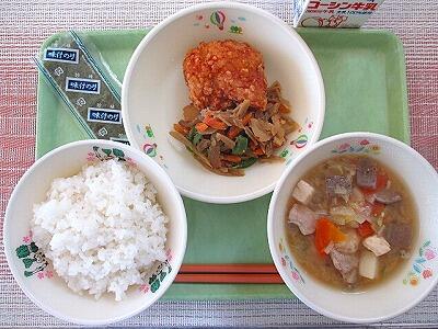 風早北部小学校の6年生が考えた献立がもとになっています。リクエスト給食総合ランキング第1位の「鶏のから揚げ」をメインにした和食の献立です。味噌金平にはピーマンが入ります。ピーマンは苦手という人もいると思いますが,調理方法を工夫してみるとおいしく食べることができるかもしれませんよ。