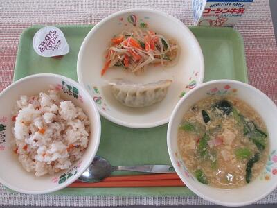 2月2日 牛乳 中華風炊き込みご飯 焼きぎょうざ バンサンスウ 中華卵スープ ひとくちぶどうゼリー
