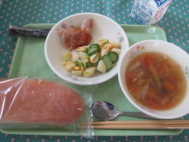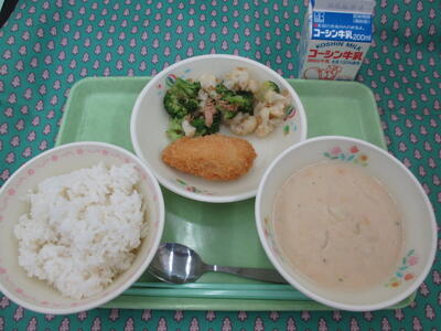 牛乳 丸パン( 横スライス ) ポークコロッケ( ソース ) コールスローサラダ ABCマカロニ入りスープ ヨーグルト