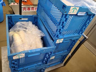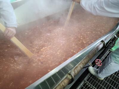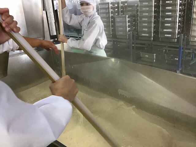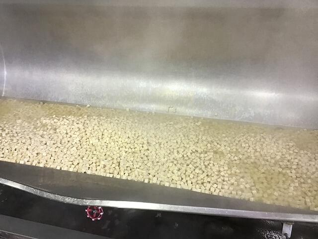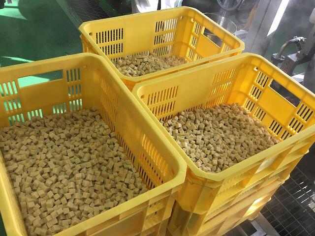 360kgくらいあります。たくさんの豆腐は,一度茹でて温めてから麻婆の具と合わせています。