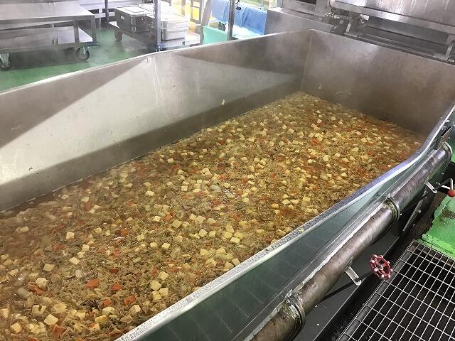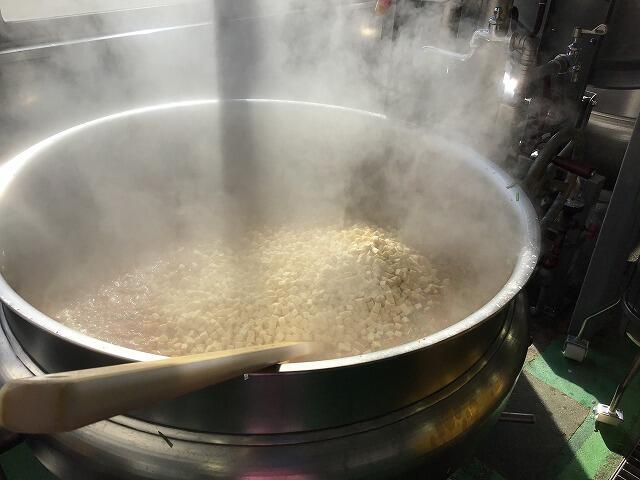 です。合わせて800kg以上になります。大きな釜5つで中華丼の具を作っていますが、具を入れると釜いっぱいになります。