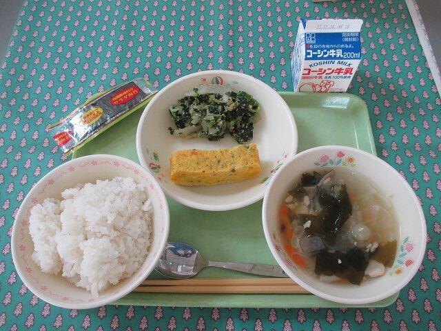 11月6日 牛乳 ご飯 韓国風味付け海苔 韓国風卵焼き「卵焼き」 ほうれん草のナムル もち米玄米入りサムゲタン風スープ