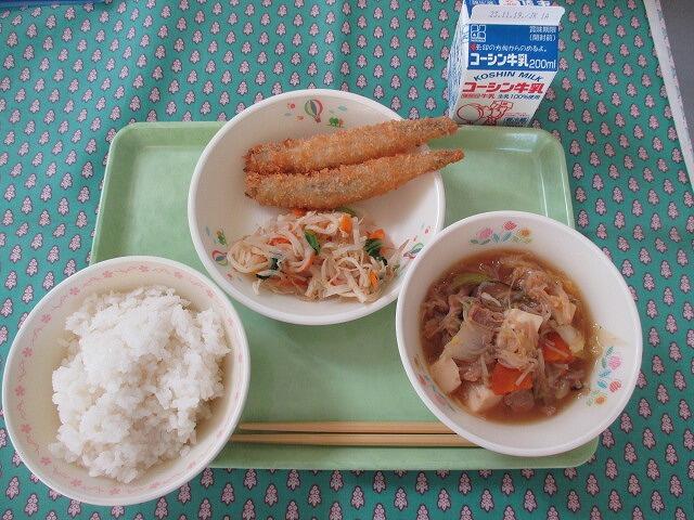 11月8日 牛乳 ご飯 ししゃもフライ(2本)切干大根入り千草和え 豚すき焼き