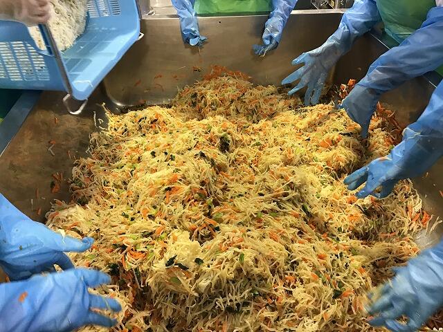 ししゃもを揚げている写真 豚すき焼き2000人分 千草和えを和えているところ
