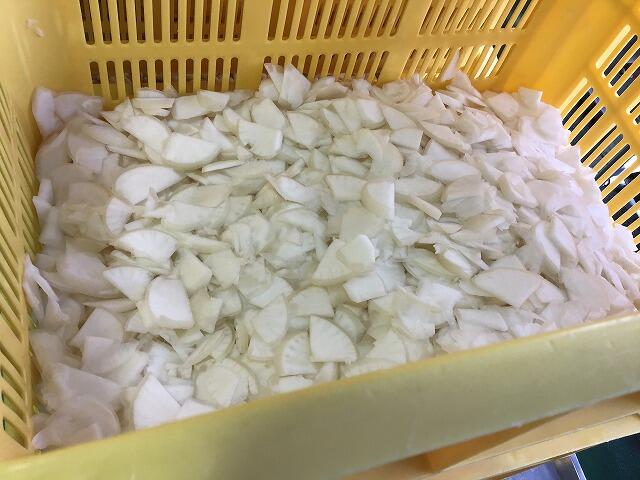 今日は人気の揚げパンです。朝から4300個近いパンを1つ1つ油で揚げて砂糖をまぶしていました。ポークビーンズの玉ねぎは全部で170kgくらいでしたが、今日は全て手作業で短冊切りにしていました。
