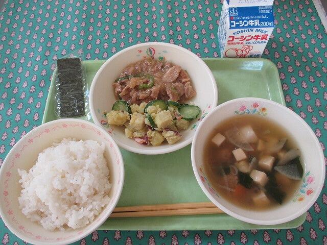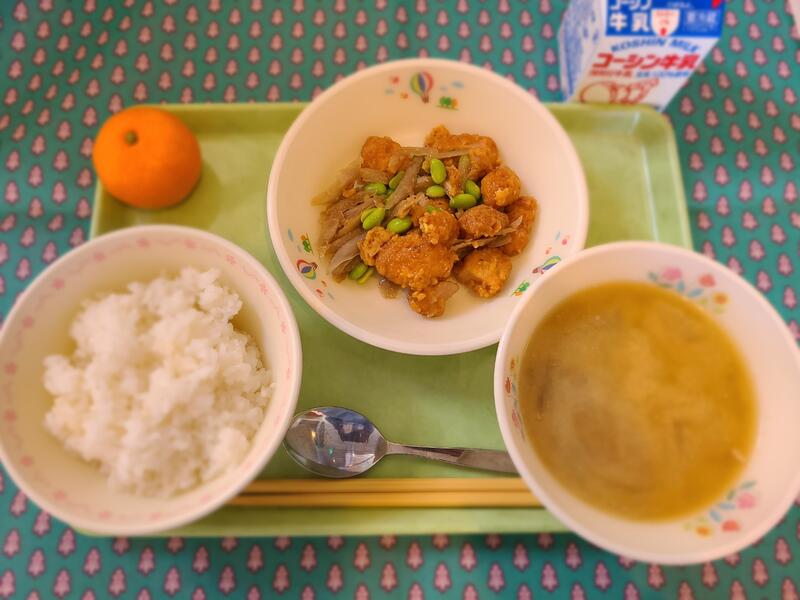 4月17日 牛乳 ご飯 ししゃもの唐揚げ(2本) のりあえ 新玉ねぎとじゃが芋のみそ汁 黒糖大豆