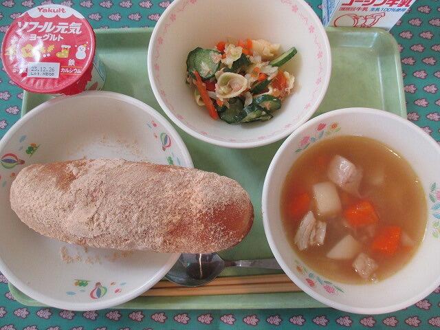 4月15日 牛乳 きなこ揚げパン 柏かぶのポタージュ(栗入り) マカロニサラダ 味付け小魚