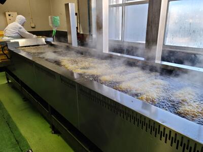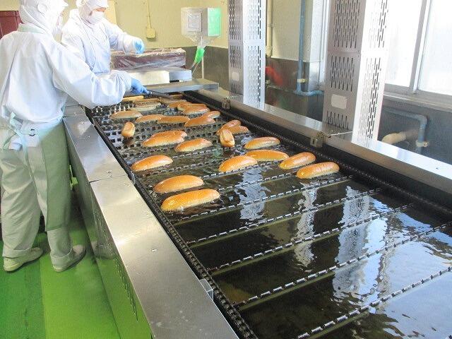 ししゃもの唐揚げは,給食センターで下味と衣をつけてからフライヤーという機械を使って揚げます。今日は約7800本のししゃもをあげています。小さい魚なので,骨も頭も丸ごと食べられます。丸ごと食べられる魚は骨の成長を助けてくれるカルシウムという栄養が入っています。