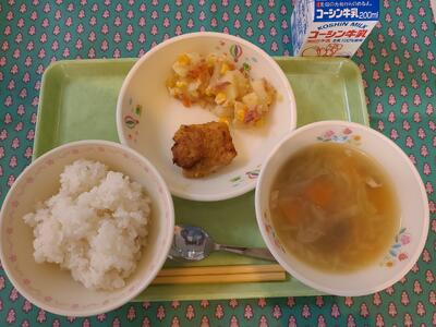3月6日 牛乳 ご飯 鶏肉の唐揚げ じゃが芋と大根のふくめ煮 キャベツと生揚げの味噌汁