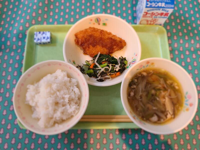 12月1日 牛乳 ご飯 ニギス磯辺フライ(2本) 蒸し鶏ときゅうりの和え物 豚汁 黒糖大豆