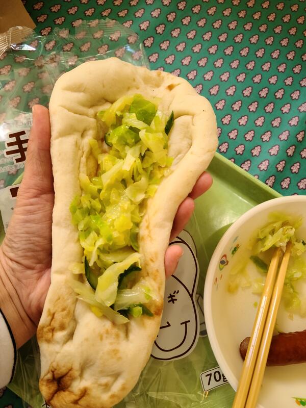 今日の多菜包子には,キャベツ・玉ねぎ・しょうがの他に,豚肉・鶏肉・ひじきが入っていて,給食センターでは蒸してから皆さんの学校へ届けています。