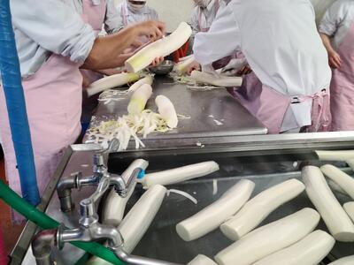 中華丼の中には,具が11種類と調味料などが11種類入っています。600kgくらいの使って大きな釜5つで作っています。いろいろな食材からうまみがでているので,よく味わって食べてみてくださいね。